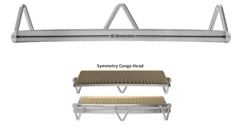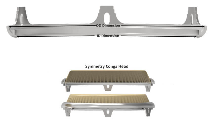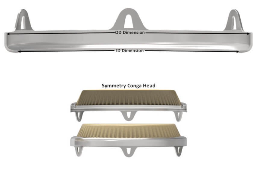 Listed are various styles of Traditional and Radius curved conga Counter Hoop Rims found in modern manufacturing. Referring to the Counter Hoop Rim Style Chart, determine which counter hoop shape best matches your particular counter hoop. Measure the ID and OD dimensions of the counter hoop. Some counter hoops will not necessarily have an OD dimension. The cut and front views of each hoop style in the accompanied chart show how the counter hoop works and fits with Remo's Symmetry Conga drumhead.